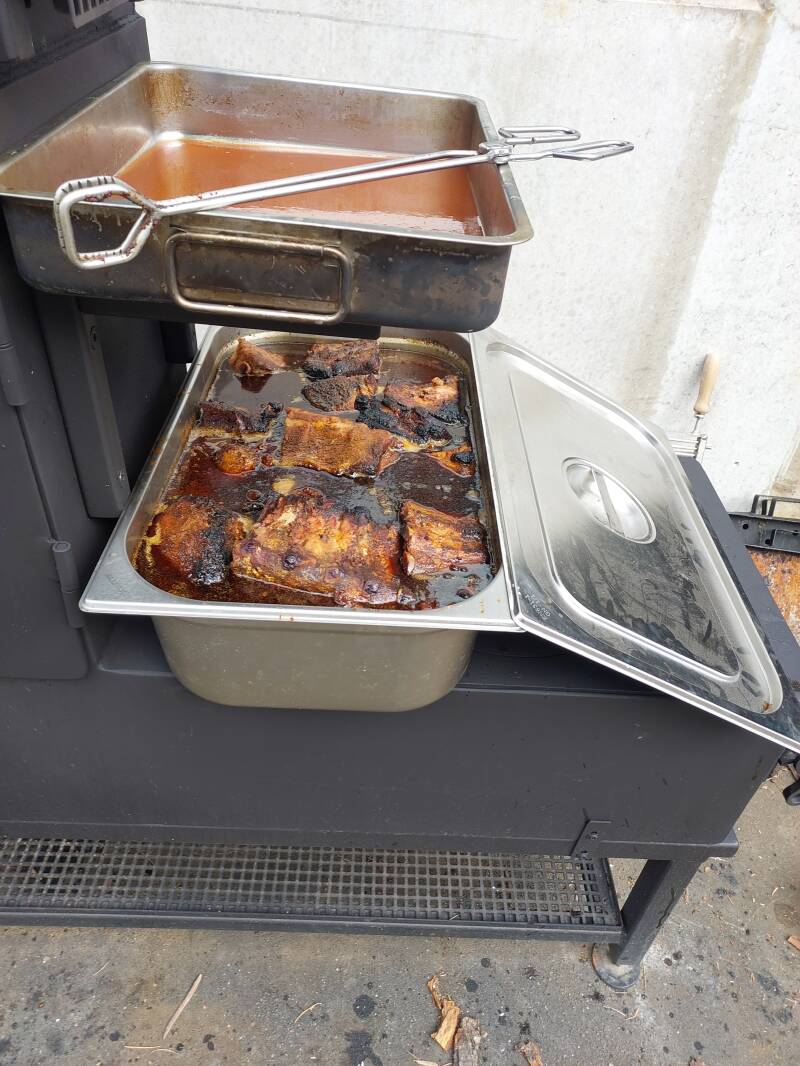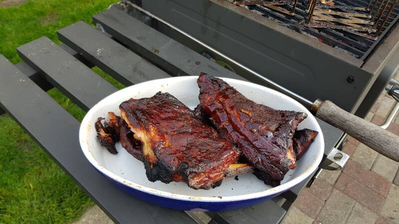 Nach dem Smoken geht's dann ab auf die Hexe in den Apelsaft mit etwas BBQ Würzung. Das ungefähr für 1.5 bis 2 Stunden.